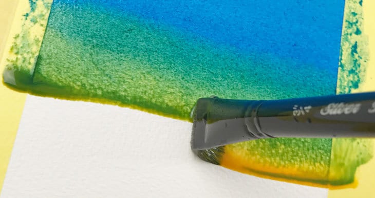 A watercolor wash brush. Washes are usually painted with large soft brushes. But you should try to adapt the size and type of brush to the size of your wash area. Think about the kind of wash you’re aiming for and choose your brush accordingly. Some brushes make the job easier than others. For example if the wash is small or irregularly shaped a number 8 round brush will probably do the trick. For large surfaces a 1” flat brush or something like a number 16 mop brush is a good choice. Squirrel hair is also a favorite because of it’s excellent handling properties and its ability to hold a large reservoir of water (read this article for more details on choosing the best brushes).
