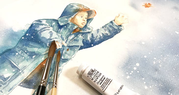 For the next step you’ll need some white gouache. This is to add a final effect of snowflakes over the painting. Why am I using gouache rather than white watercolor? Well… Gouche is more opaque than watercolor. This is because the pigments in gouache are larger plus contain additives like calcium carbonate to make the paint less transparent. But it can be dissolved in water just like watercolors. I’m using Winsor and Newton’s permanent white gouache (find it on Amazon) because it has a pure white color appearance.