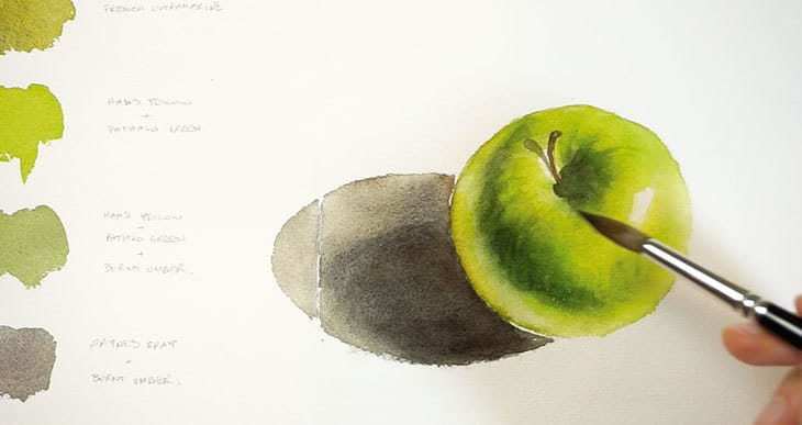 Start by dropping in a bright green color into the areas of mid and dark values. Don’t paint over the brightest side of the apple on the right and the areas around the highlights and the reflected light. You want these to remain very light in value.
