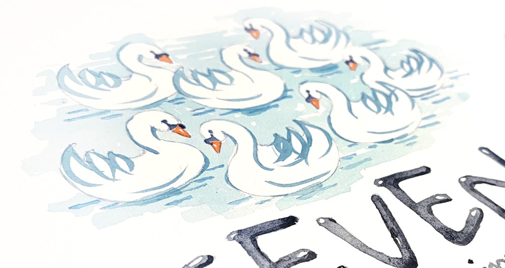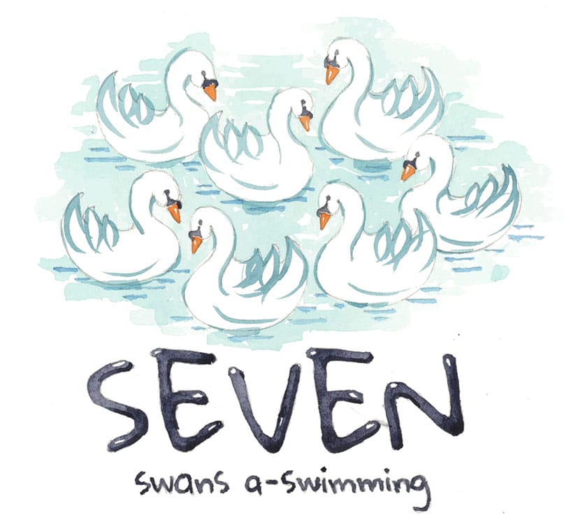 Add some shadow lines to the word “SEVEN” and fill in the words “swans a- swimming”.