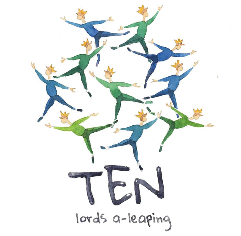 I’m glad you’re still here! Day ten in this series of themed watercolor paintings is “10 lords a-leaping”!