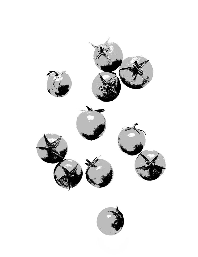The next step is to paint darker shapes to represent the form shadows on the tomatoes. You can see these rough shapes here in this monotone value image. (All of the reference images and studies are available on my Patreon page).