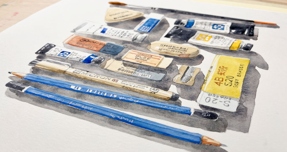 My approach to painting all of these objects was to build up the layers of watercolor paint little by little. So most of the time I’m using a glazing technique, letting one object dry before applying a new layer of paint. I also tried to paint similar colored objects together so I wasn’t spending too much time changing my paint mixtures.