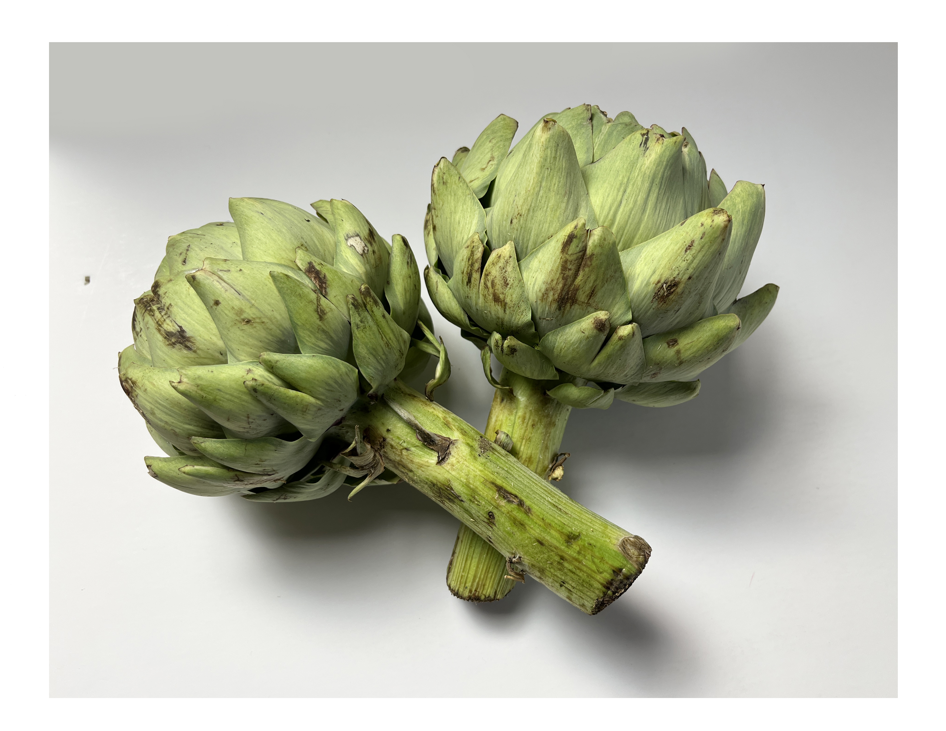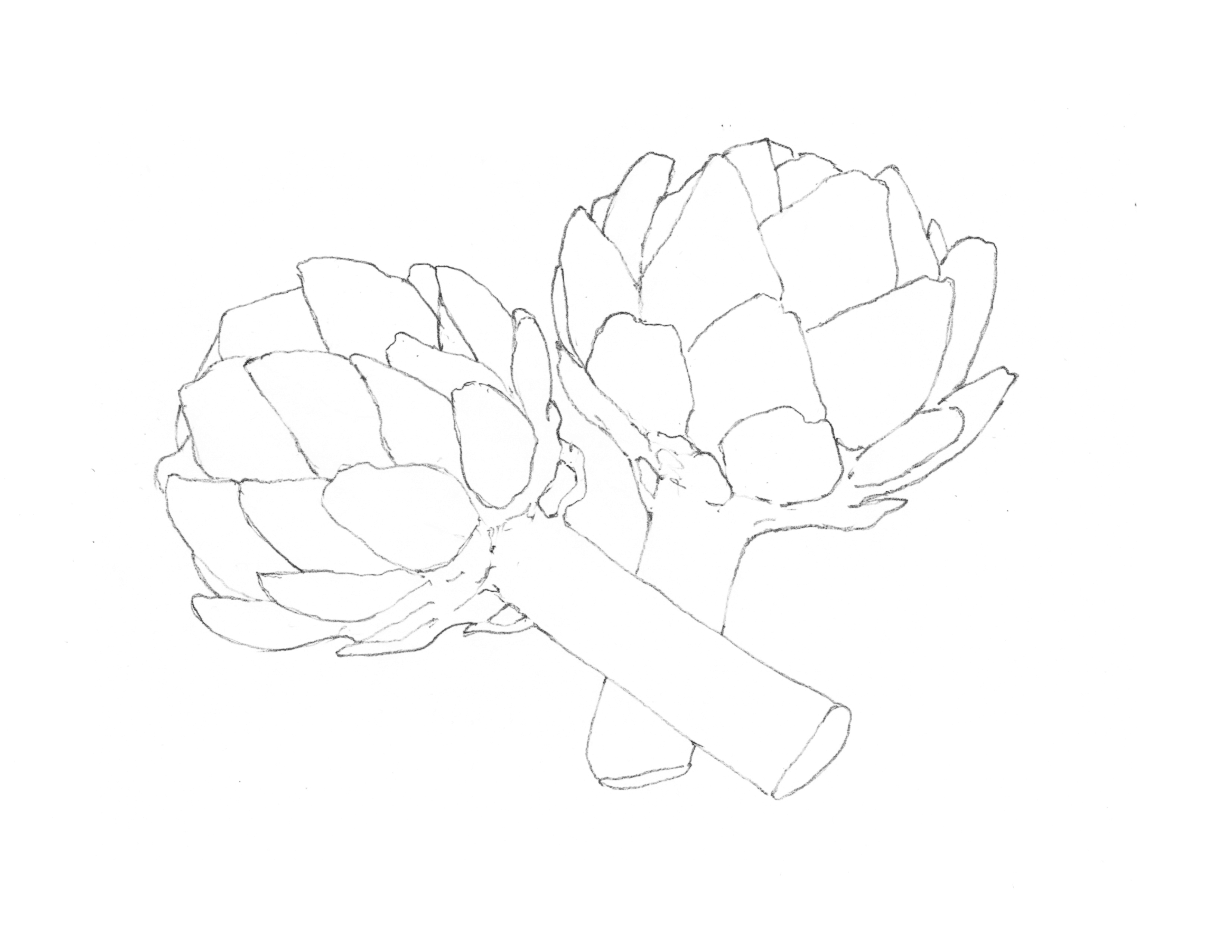 Also, I treated the head of the artichokes a bit like a sphere – thinking about where the light hits from the top left. So I used lighter green for the leaves catching the light, and gradually deepened the color as I moved towards the shaded side of each artichoke.