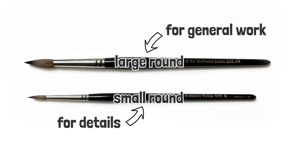 Earlier I said you want “versatile” brushes, and a large round brush is probably the best all-round type of brush you can get. You can apply a large range of brush strokes with a round brush, from detailed marks to broad washes.