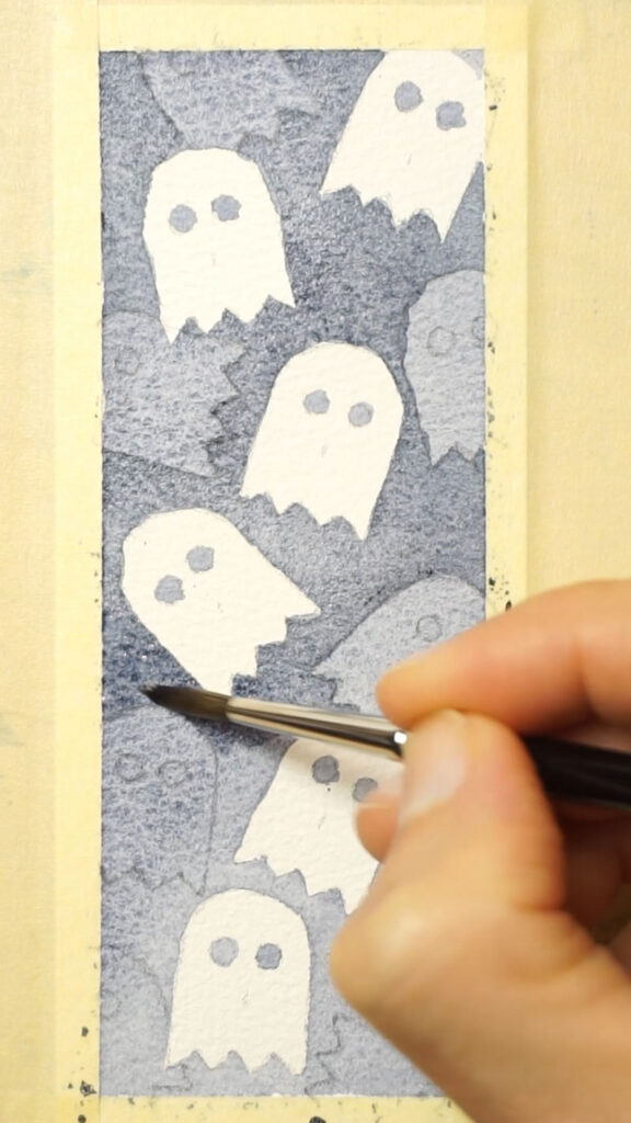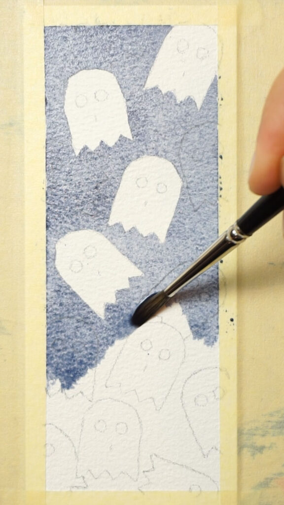 Mix up a fairly transparent wash of paint and start painting around the first ghost shapes. I’m using a small brush for this because the details are quite delicate, and it helps me stay within the lines. Just take your time and slowly work your way around each ghost, letting the paint flow smoothly.