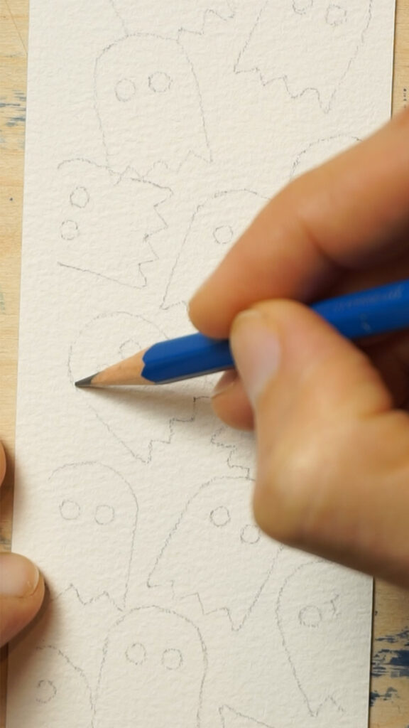 Trace the ghost pattern on the paper. For this you can download the free outline template below – or just sketch something similar, filling up the sheet with a bunch of little ghost shapes.