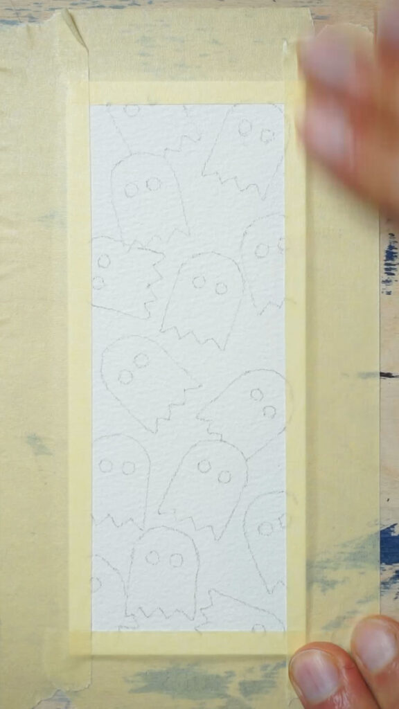 Next, tape down the bookmark onto a flat board using low-tack masking tape. The tape will protect the edges of the paper and leave a nice white frame around the painting. Make sure the tape is well stuck down so that the paint doesn’t bleed underneath the edges while you paint.