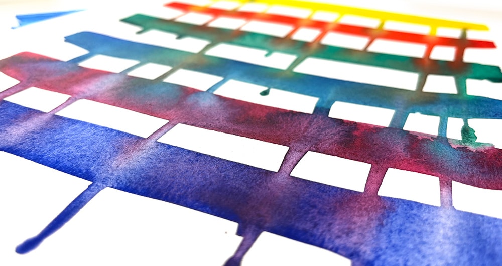 Pigments will begin to flow down the lines if your colors are wet enough, producing drips at the end of each vertical pathway.