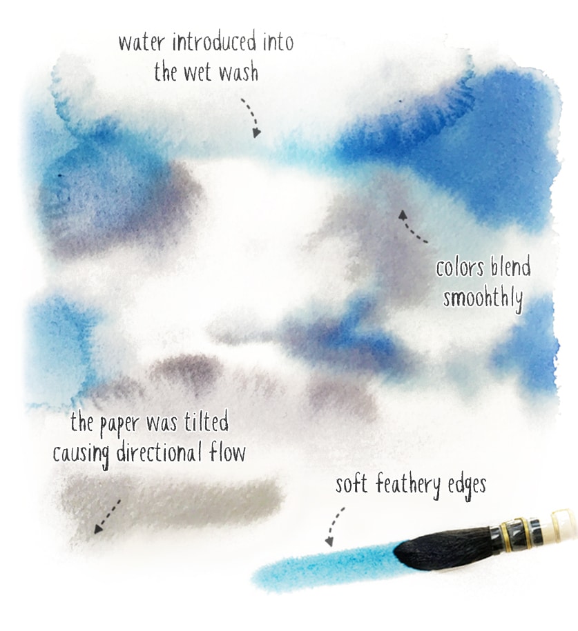 This is essentially a wet-on-wet technique. The wetness of both paper and paintbrush changes the resulting effects.